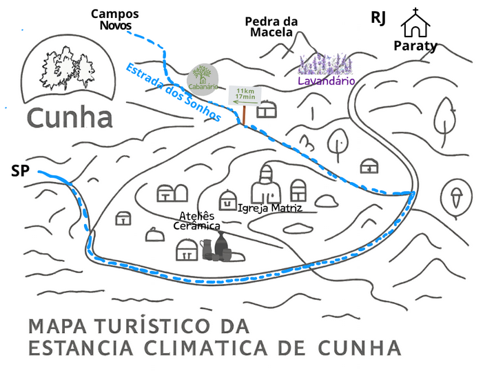 O “toque” rural da Estrada dos Sonhos, que vai de Cunha ao Subdistrito Campos Novos é toda asfaltada e muito charmosa, com uma bela vista do mar de morros e por do sol deslumbrante. É o caminho que prepara a sua mente para a desconexão total. Aqui a distância é 17 minutos/11 km do centro histórico e do comércio da cidade.
